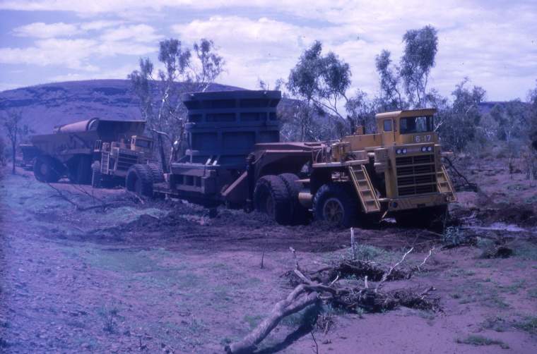 BA2817/2412: KW Dart trucks, hauling the primary crusher to Mt Tom Price, bogged on the road from King Bay, 1965