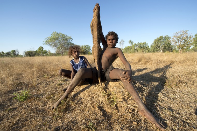 BA2840/424: Davis and Grace Hall with a goanna they caught in the Ord Valley, 29 July 2017