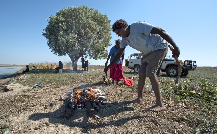 BA2840/427: Marcus Hall removing a duck from the fire in the Ord Valley, 29 July 2017
