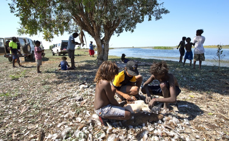 BA2840/430: Boys from Kununurra plucking a bush turkey for cooking in the Ord Valley, 29 July 2017