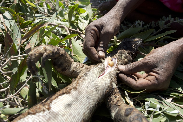 BA2840/432: Jodie Hall showing me the healthy fat in the goanna's throat, Ord Valley, 29 July 2017