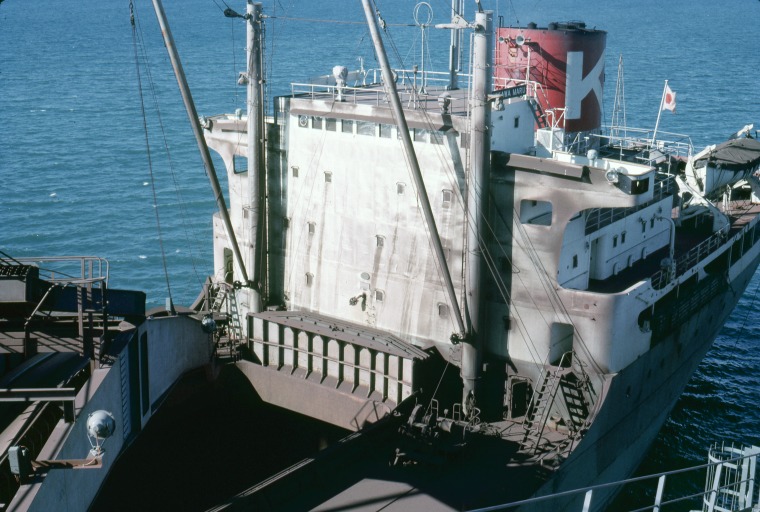 BA2817/2600: First ore over the shiploader at Parker Point (Dampier) into the hold of the Tachikawa Maru, August 1966