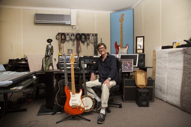BA2493/1173: Hank Marvin in his Northbridge recording studio with guitars including the red Hank Marvin Fender Stratocaster, 20 May 2017
