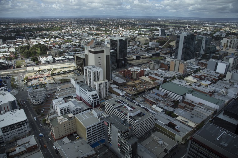 BA2493/1176: North east across Perth, the Perth City Link redevelopment and Northbridge, Milligan St at left and an apartment building under construction on Murray St, 25 October 2017