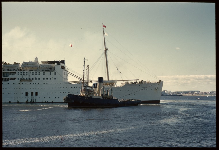 145776PD: P&O ship Straithaird and tugboat, Fremantle Harbour, June 1966.