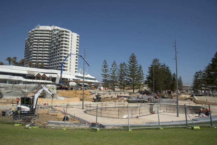 BA2493/1313: View south over the skate park under construction, the Rendezvous Hotel in the background, Scarborough Beach 5 December 2017