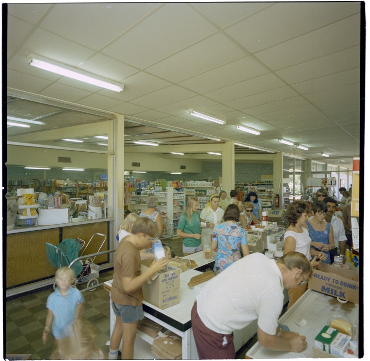 329317PD: The supermarket checkouts with the pharmacy in the background inside Tom Price Shopping Centre, ca. 1973