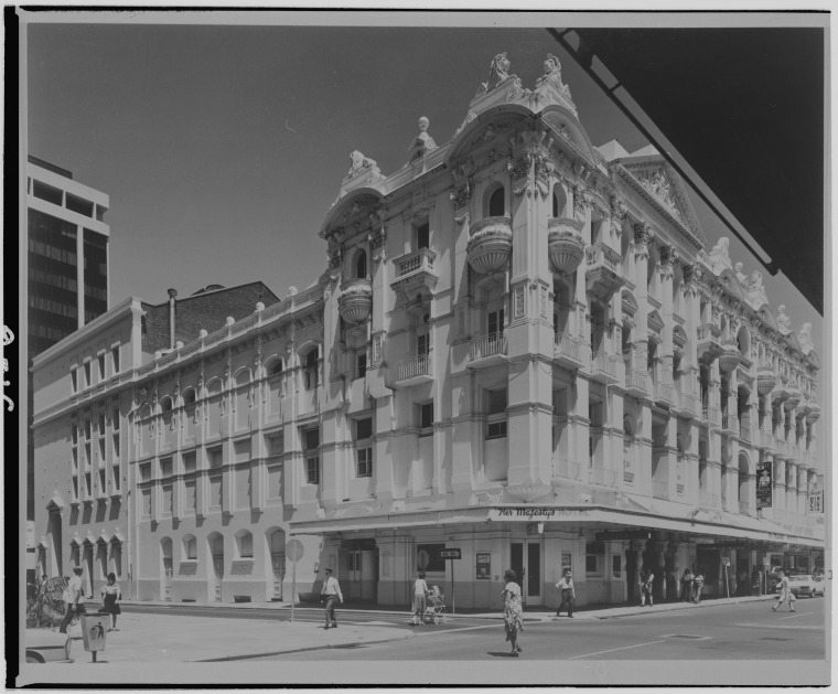 325901PD: Copy of a photograph of His Majesty's Theatre incorporating Her Majesty's Hotel, Perth, probably about 1978