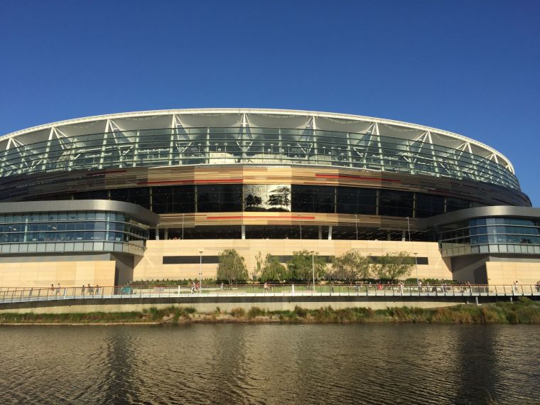BA2944/6: Close up of western exterior, showing floor to ceiling glass windows of the Riverview rooms, Optus Stadium.