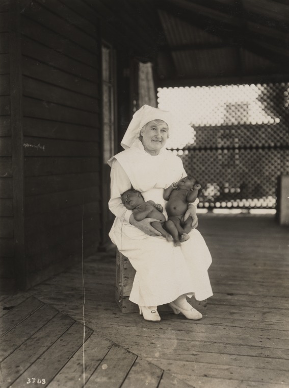 BA368/5/94: Nurse holding two Aboriginal babies, Moore River Native Settlement, Western Australia, ca. 1920.