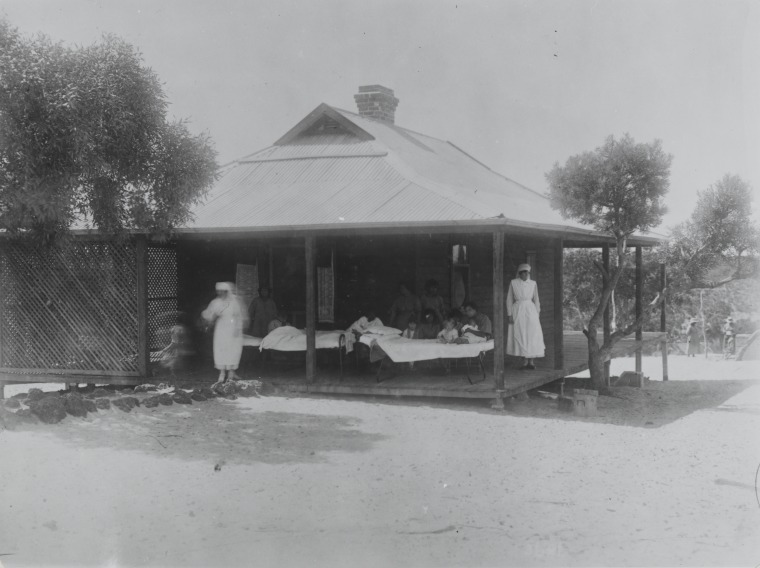 BA863/179: Nurse holding two Aboriginal babies, Moore River Native Settlement, Western Australia, ca. 1920.