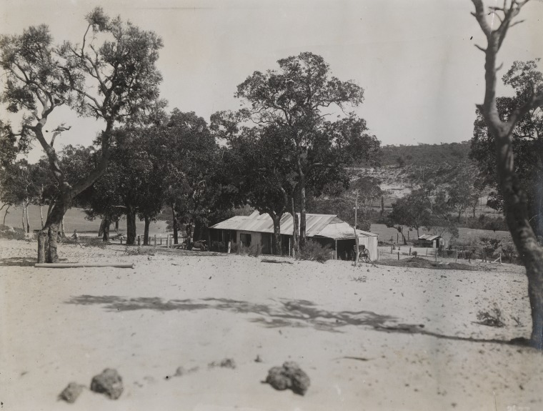 BA368/5/89: Unidentified building mostly constructed out of tin, Moore River Native Settlement, Western Australia, ca. 1920.