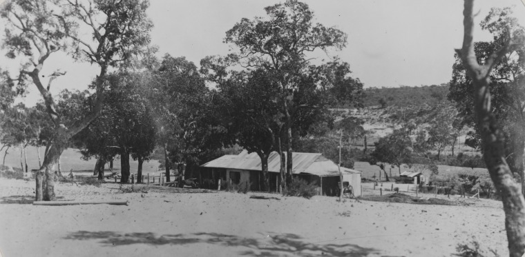 BA863/17: Unidentified building mostly constructed out of tin, Moore River Native Settlement, Western Australia, ca. 1920.