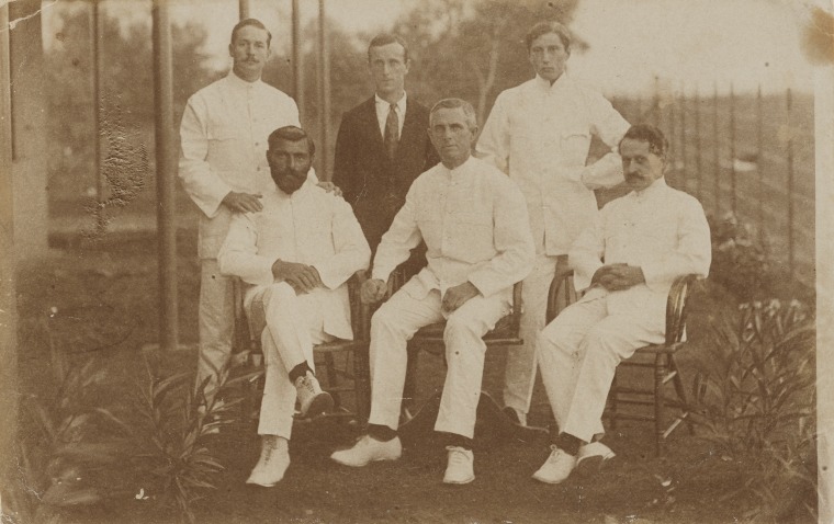 BA318/96/56: Left-right: A.H. Hayman, C.J. Lennon, J.H. Leverett, R.E. Althaber, J. Leslie (O.I.C.), J. Green (Mechanic). The Broome Radio Telegraph Station, ca.1914