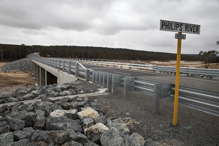 BA2493/1438: New Phillips River Bridge, Ravensthorpe, 10 March 2018. Note incorrect spelling of Phillips River on sign in the foreground