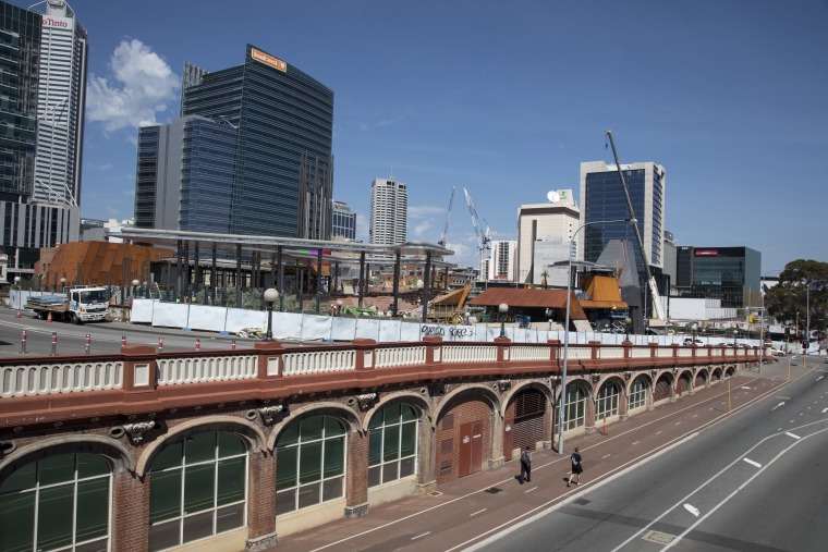 BA2493/1664: Construction of Yagan Square viewed from the Urban Orchard across Roe Street and the Horseshoe Bridge, 6 February 2018