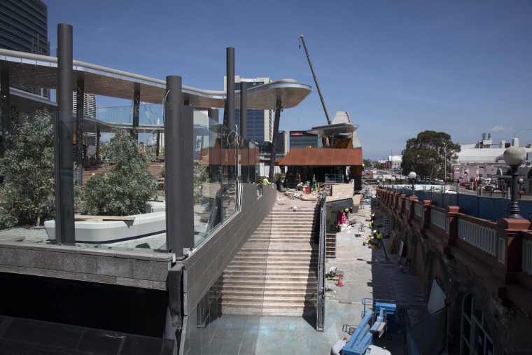 BA2493/1665: Construction of the upper terrace (at left) which will house the amphitheatre, and the steps down to lower level, viewed from the Horseshoe Bridge, 6 February 2018