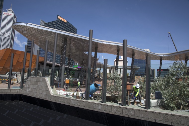 BA2493/1666: Construction of the upper terrace with its irregular canopy roof covering the amphitheatre, viewed from the Horseshoe Bridge, 6 February 2018
