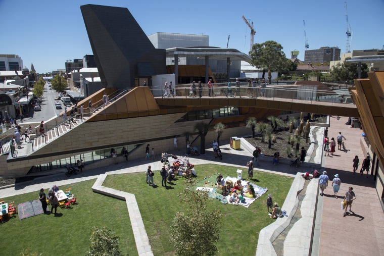 BA2493/1673: Yagan Square on opening day, 3 March 2018. The lawn and the Waterline water feature sculpted in W.A. granite, in the background William Street, Northbridge
