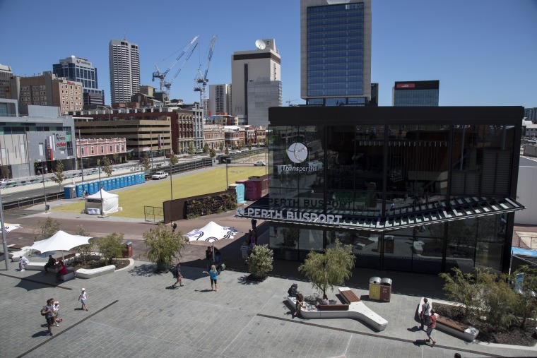 BA2493/1674: Yagan Square on opening day, 3 March 2018. From the upper deck west across the concourse and the William Street entrance to the Perth Busport, at left is Wellington Street