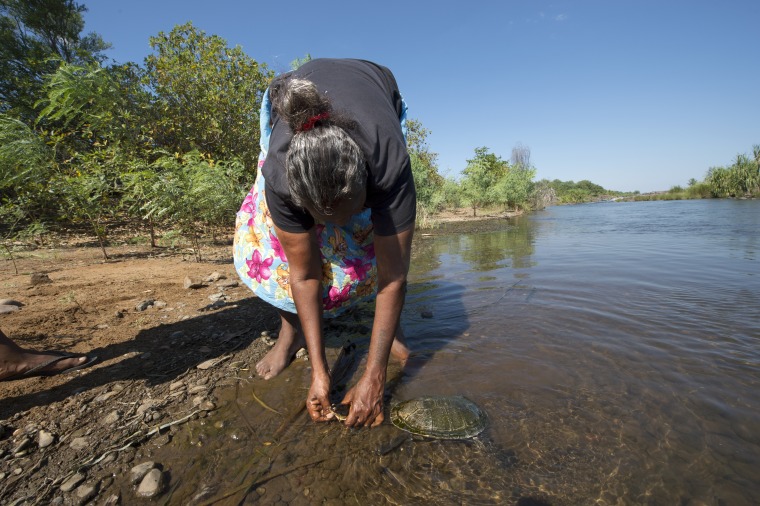 BA2840/566: Jodie Hall unhooking a turtle she has caught at Fords Beach, Kununurra, 18 April 2018