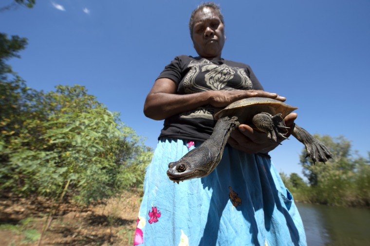 BA2840/567: Jodie Hall with a long neck turtle at Fords Beach, Kununurra, 18 April 2018