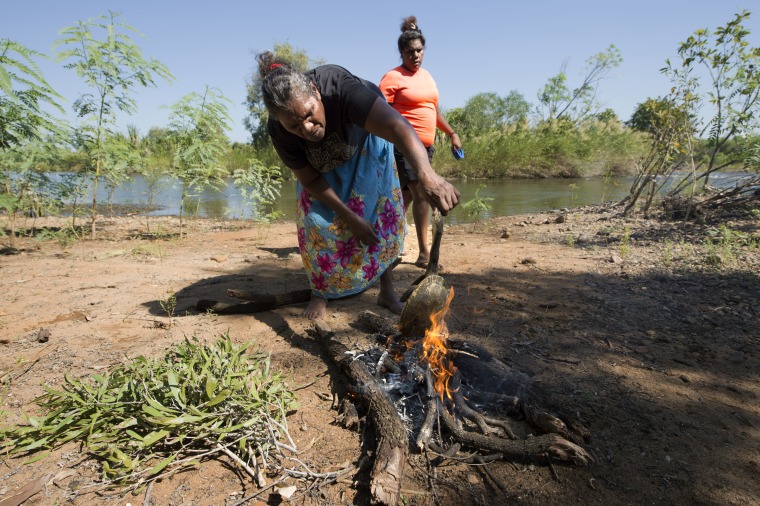BA2840/570: Jodie Hall moves the turtle through the flames to loosen the meat in the shell, at Fords Beach, Kununurra, 18 April 2018