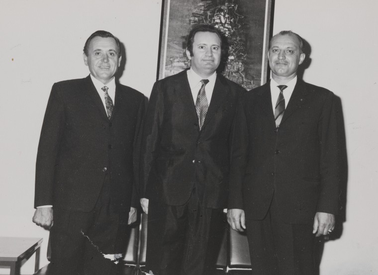 BA1626/82: Left-right: Unknown, Romano Mussolini, Gianfranco Merizzi at the W.A. Italian Club, December 1968