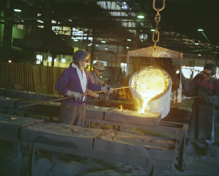 385850PD: Pouring molten metal at the Chamberlain John Deere factory, Welshpool, 24 June 1977