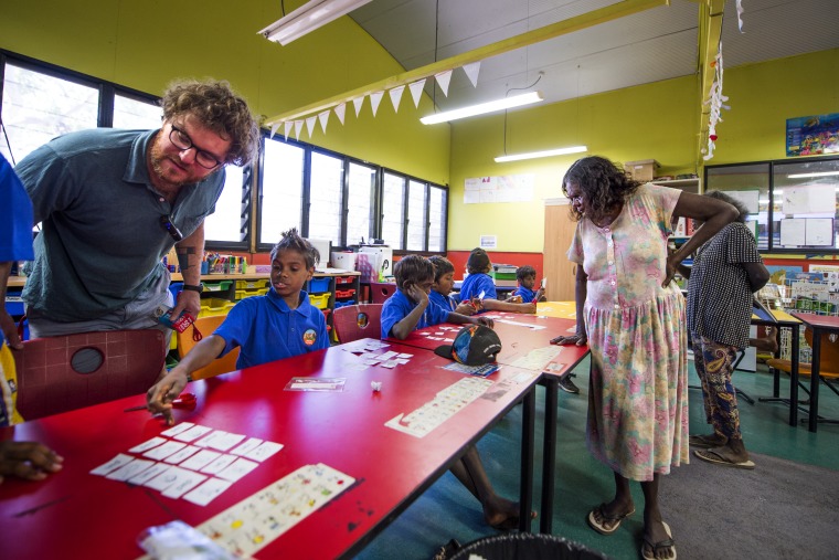BA2840/774: Louis Gill teaches a middle primary class with the aid of Gija elders Beryline Mung Mung and Sadie Carrington (far right), 31 August 2018