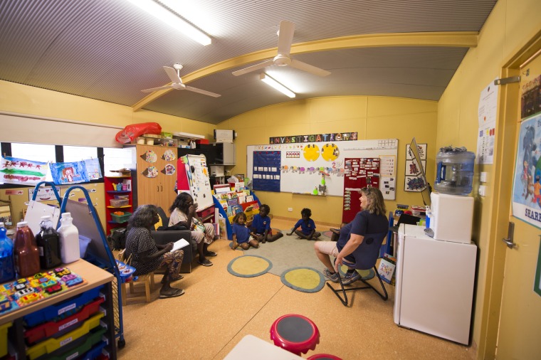 BA2840/763: Teacher Amanda Rowe (right) and two elders wait in the preschool classroom for the students to arrive, 31 August 2018