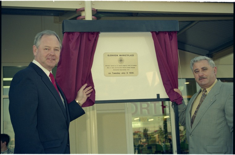 371906PD: Charlie Gregorini (left) and Brian Edwards officially open Glenview Marketplace, Ballajura, 9 July 1996