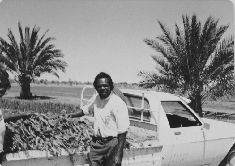 88751PD: Johnny Abbott with a ute loaded with carrots, Desert Farm, Wiluna, Western Australia, ca. 1975.
