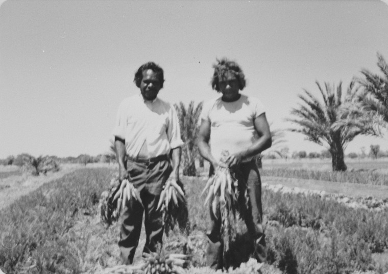 88752PD: Johnny and Ned Abbott in a carrot field, Desert Farm, Wiluna, Western Australia, ca. 1975.