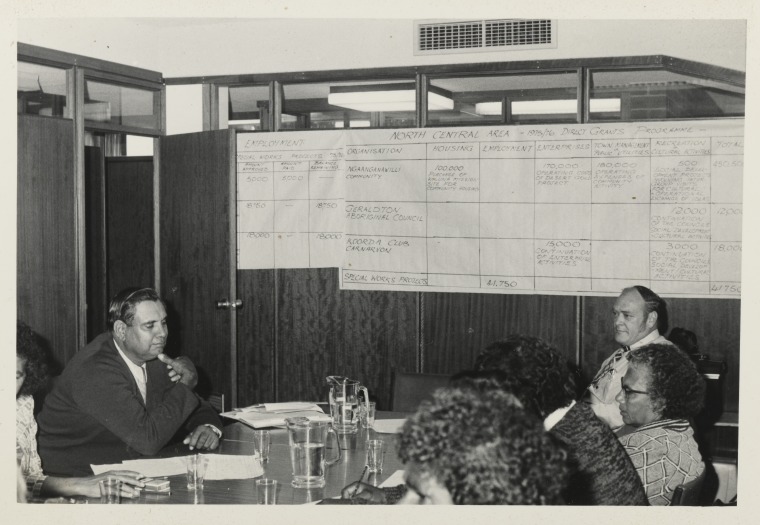 BA863/72: Department of Aboriginal Affairs meeting in progress, possibly at their Geraldton offices, Western Australia, 1976?