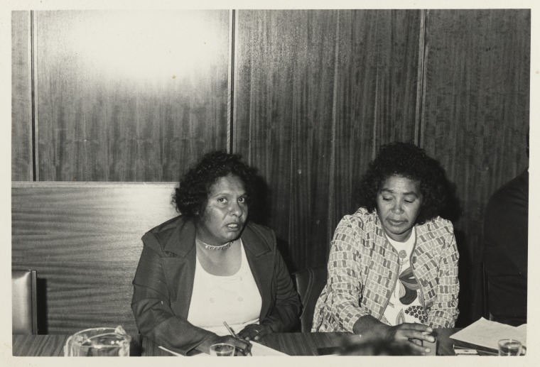 BA863/93: Doris Pilkington and Marjorie Coffin at a Department of Aboriginal Affairs meeting in progress, possibly at their Geraldton offices, Western Australia, 1976?