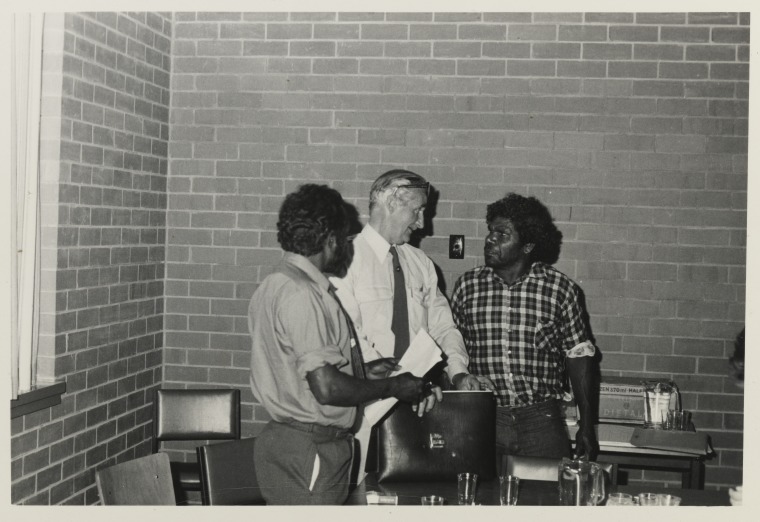 BA863/95: Duncan Lamont and two council members of the Nyangganambi Community at a Department of Aboriginal Affairs meeting in progress, possibly at their Geraldton offices, Western Australia, 1976?
