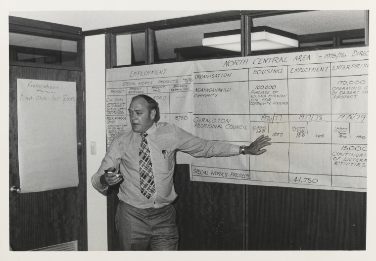 BA863/88: Department of Aboriginal Affairs meeting in progress, possibly at their Geraldton offices, Western Australia, 1976?
