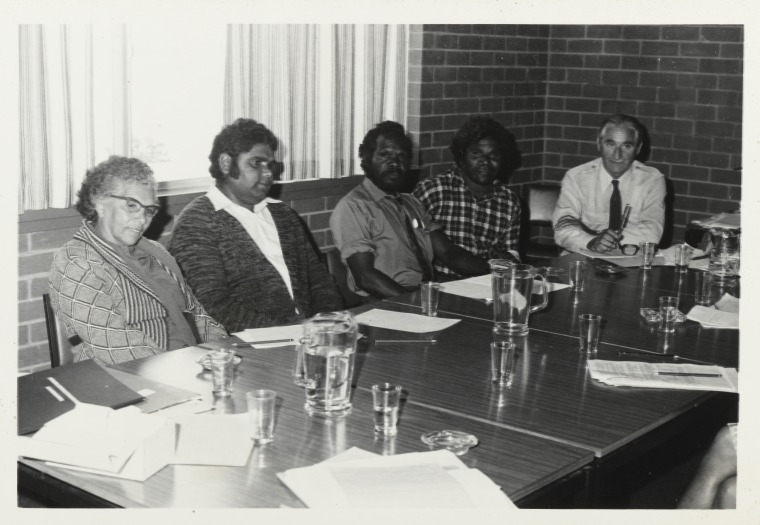 BA863/89: Department of Aboriginal Affairs meeting in progress, possibly at their Geraldton offices, Western Australia, 1976?