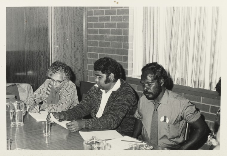 BA863/90: Department of Aboriginal Affairs meeting in progress, possibly at their Geraldton offices, Western Australia, 1976?