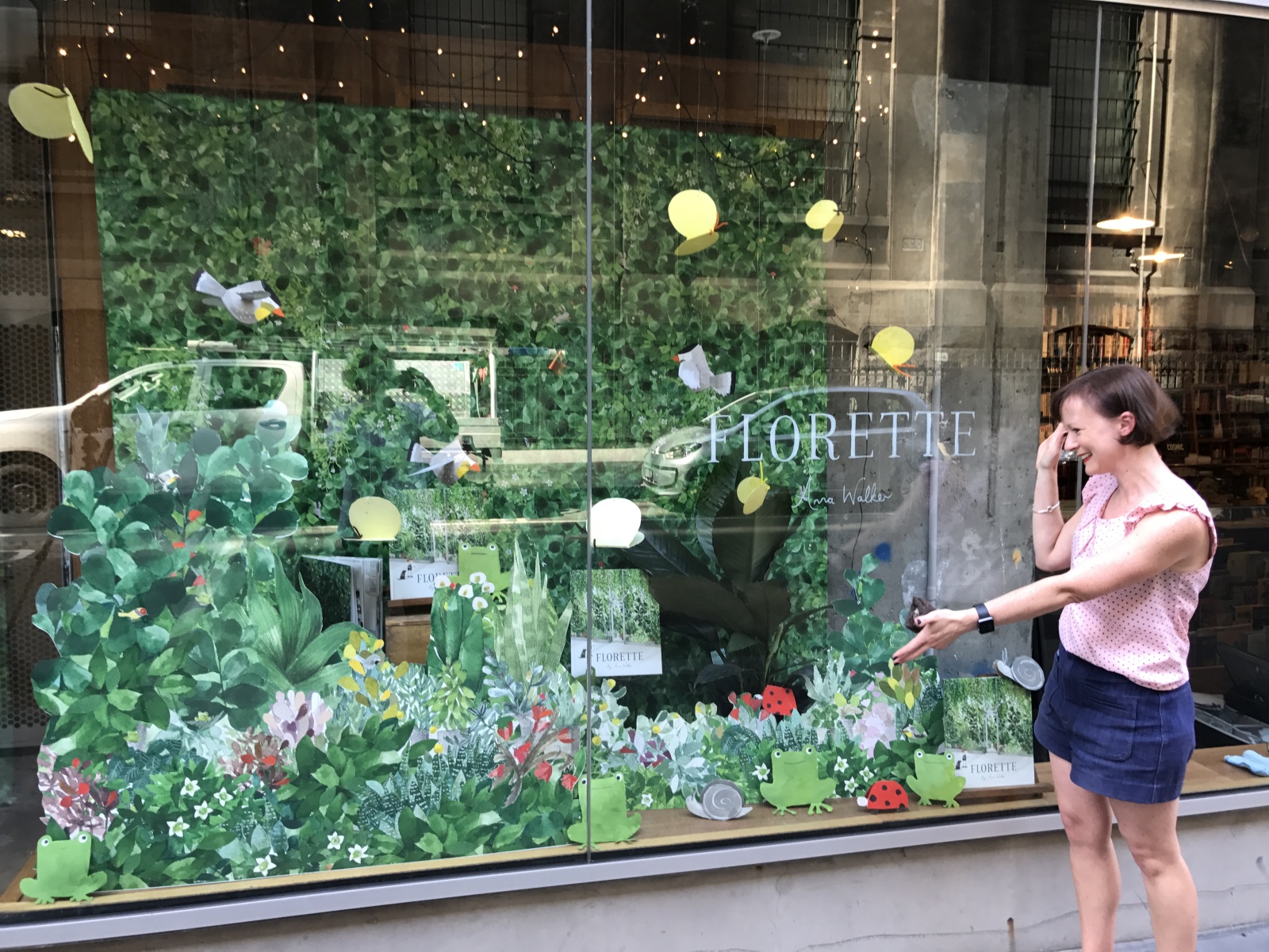 PWC/281/5/4/1D: Photograph. Completed Embiggen Books window display with Anna Walker.