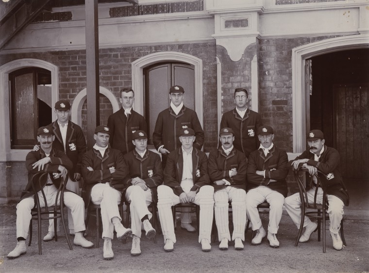 BA1200/208: L-R: Sitting: J. Humphries, S.F. Barnes, L.C. Braund, A.O. Jones, F.L. Fane, W. Rhodes, E.G. Hayes; Standing: J. Hardstaff, C. Blythe, J.N. Crawford, R.A. Young, October 1907