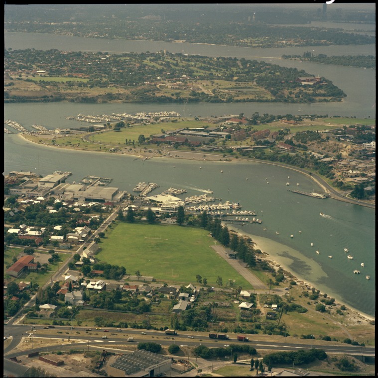 390573PD: Across Gilbert Fraser Reserve to Pier 21 Marina at Point Direction, North Fremantle, 28 April 1989