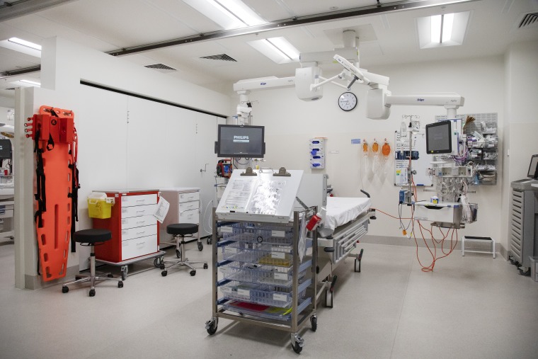 BA2493.2007: POD A, the principle receiving POD in the Emergency Department, resuscitation room. Note the portable stretcher (orange) hanging on wall