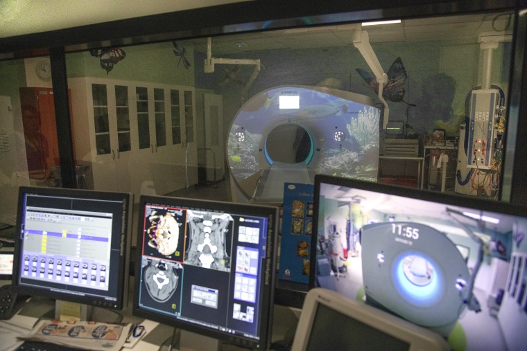 BA2493/2012: View of CT Scan from operator’s room, the CT Scan unit having an underwater scene motion projection to help relax and distract children while undergoing CT Scan