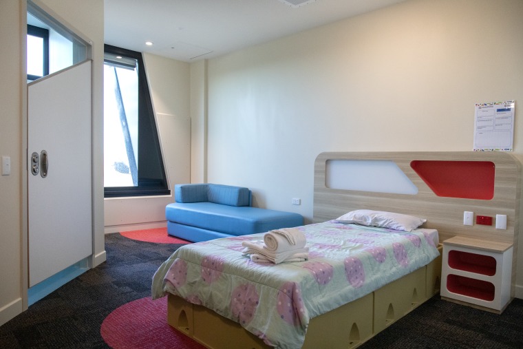 The Mental Health Inpatient Unit on Ward 5A, Level 5, Perth Children's Hospital. BA2493/2081: The common area, and beyond, outdoor area in POD 2 (Adolescent Ward) of Mental Health Ward 5a, level 5. The Mental Health Inpatient Unit on Ward 5A at PCH is the state-wide assessment and treatment facility for children and young people up to 16 years old with complex and acute mental health issues. Ward 5A is a recovery focused patient and family centred service. It offers a seven-day multidisciplinary program in a safe environment for voluntary and involuntary patients. The Ward has a total of 20 beds and is divided into two sections - a 14-bed acute section for children and adolescents who require a higher level of assessment, monitoring and treatment, and a low-acuity section with 6 beds for those who require less support and supervision during their treatment and recovery. BA2493/2082: The Winter Garden area in POD 2 (Adolescent Ward) of Mental Health Ward 5A, Level 5. BA2493/2083: The Common Area with Private single rooms off the side (each with window), at POD 3 - Low Acuity Ward. Cabinets have curved edges for safety in event of aggressive or self-destructive behaviour by patients. BA2493/2084: Typical Patient Room in POD 3 - Low Acuity Ward. The toilet/bathroom is equipped with a safety lock, and the door itself doesn’t continue to the full extent of the door opening, so staff can have access to patients if needed. BA2493/2085: Secure Nurses Station and Common Area, with TV placed in secure safe cabinet, at POD 3 - Low Acuity Ward. The nurses station is equiped with safety windows and is accessed using a secure door lock.