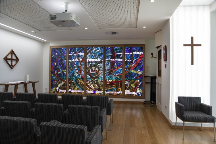 BA2493/2088: The Multi-Faith Room with stained-glass artwork incorporating symbolic references to a number of religions