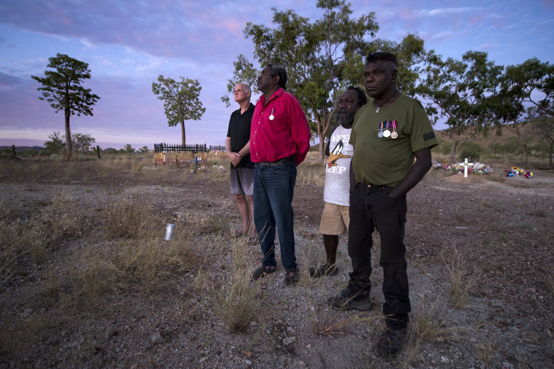 BA2840/1074: L-R: Unknown, Mark Nodea, unknown, Gabriel Nodea observe Anzac Day 2019 in Warmun Cemetery