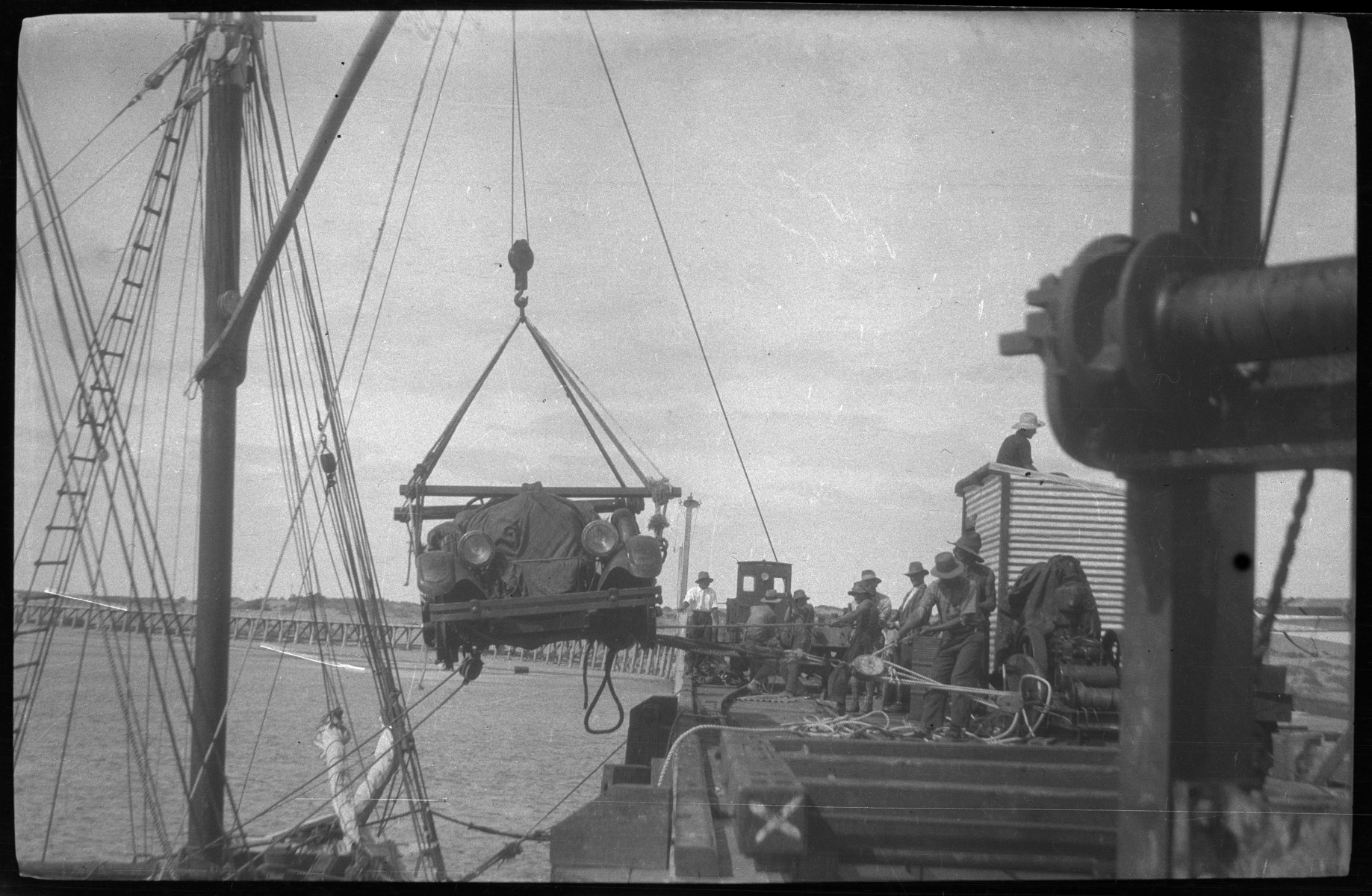 179035PD: Loading or unloading a car at Onslow jetty, Western Australia, ca. 1933.