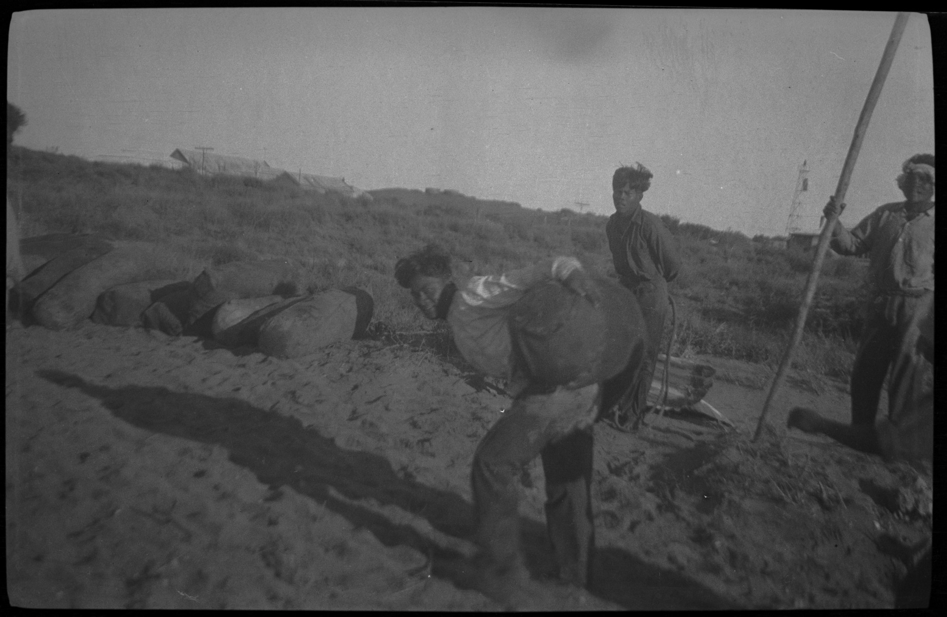 179049PD: Men unloading bags of pearl shell onto the beach, Onslow, Western Australia, ca. 1934.